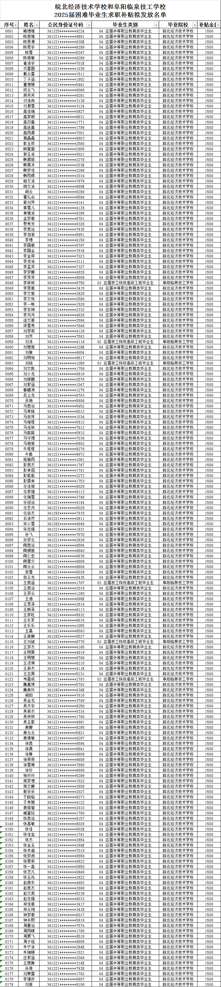 根据安徽省人力资源社会保障厅、安徽省教育厅、安徽省民政厅、安徽省财政厅、安徽省农业农村厅、安徽省残疾人联合会《关于做好2026届困难毕业生求职补贴信息化发放工作的通知》 (皖人社明电[2025]35号)文件精神,经系统申报和人工审核,确定鲍博雅等179名同学为我校“2026届毕业生求职补贴”人选。现将名单在全校范围内公示(详见附件)。公示时间:2025年12月1日至12月5日。